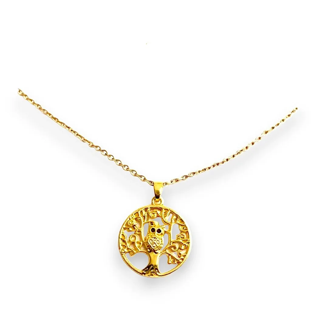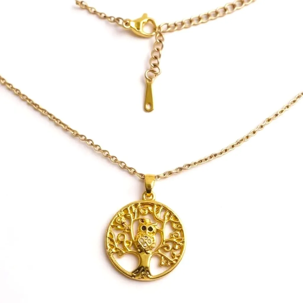 Gold Çelik Baykuşlu Yaşam Ağacı Kolye – Bilgeliğin ve Hayatın Simgesi