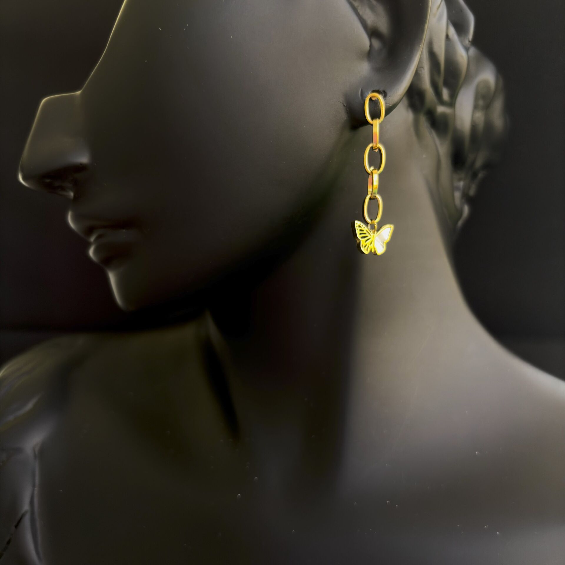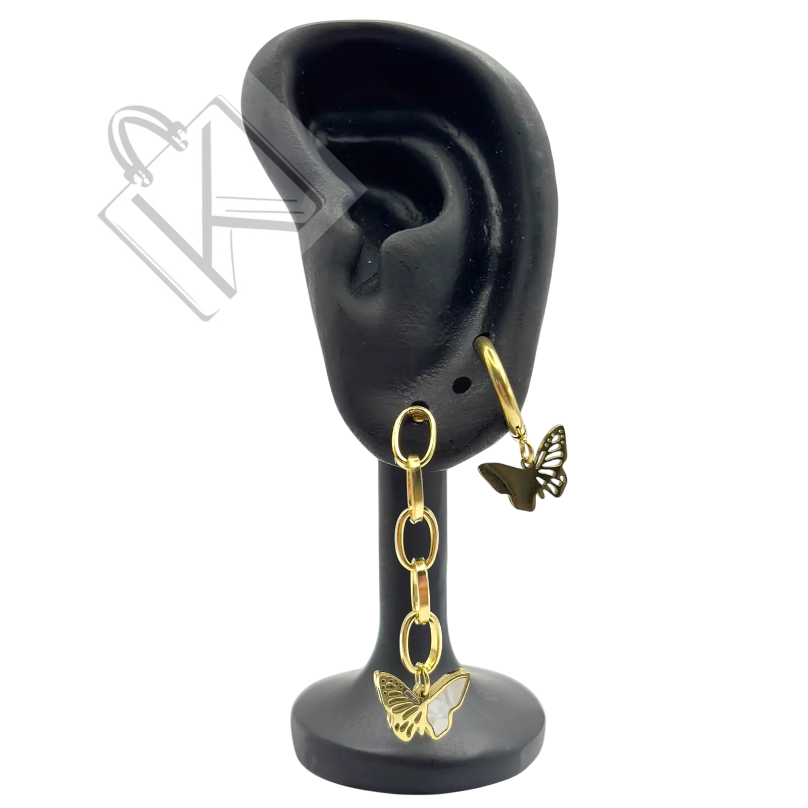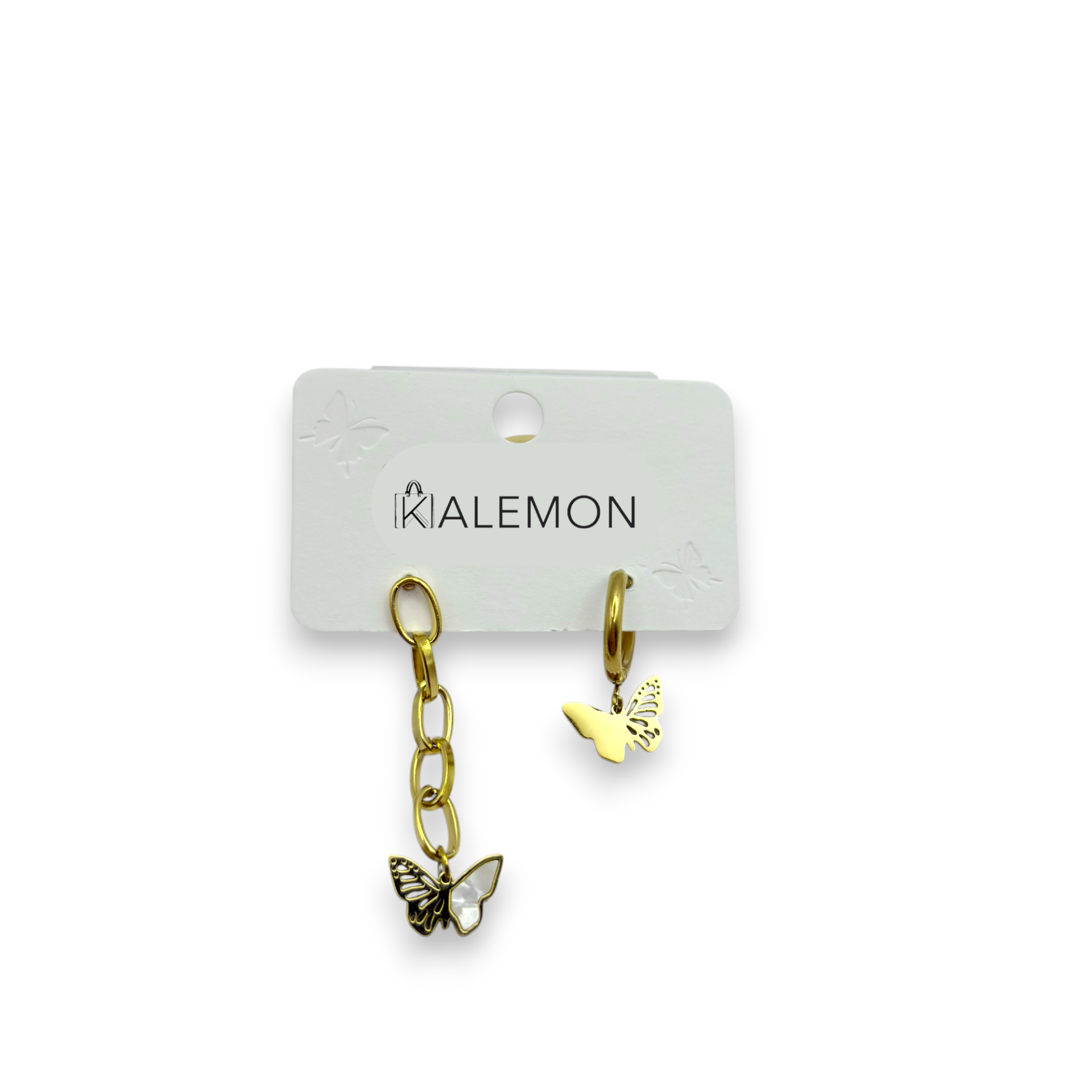 Birinci küpe, ince zincir detayıyla akışkan bir hareket yaratırken, ucundaki sedef dokulu kelebek figürü ışıltısıyla büyüler. İkinci küpe ise zarif bir halka formunda olup, altından sallanan minimal kelebek figürüyle dengeli ve sofistike bir görünüm sunar.
