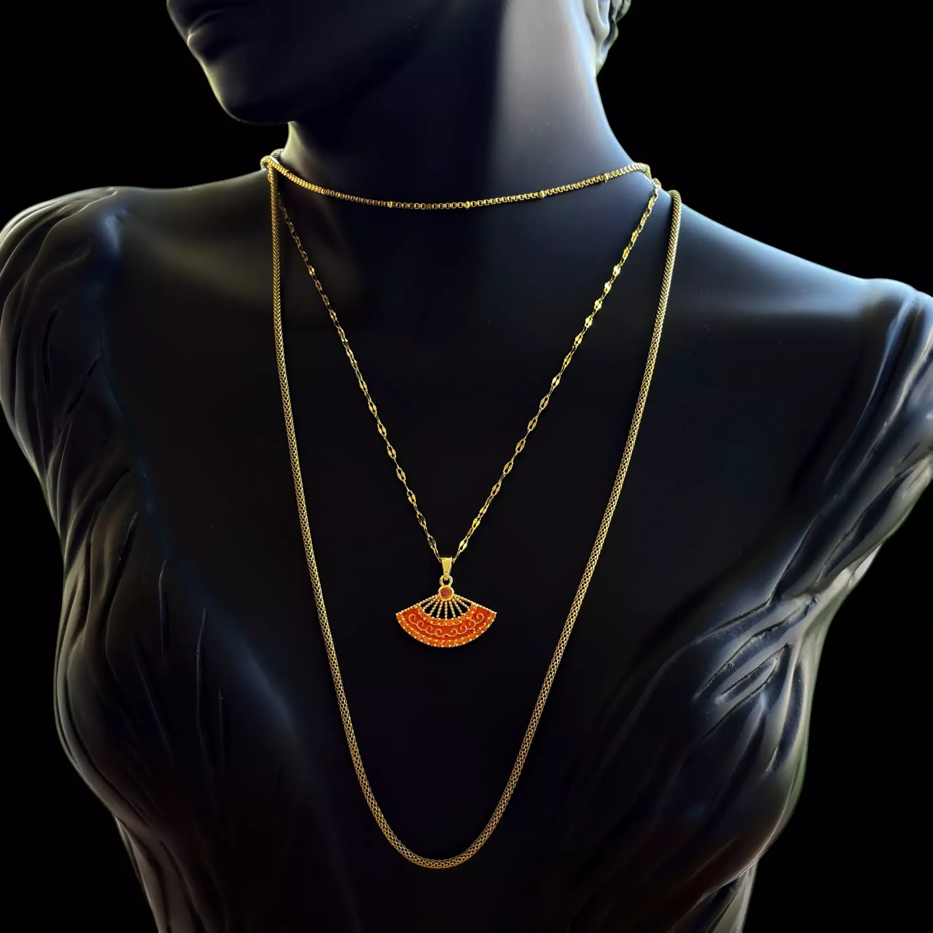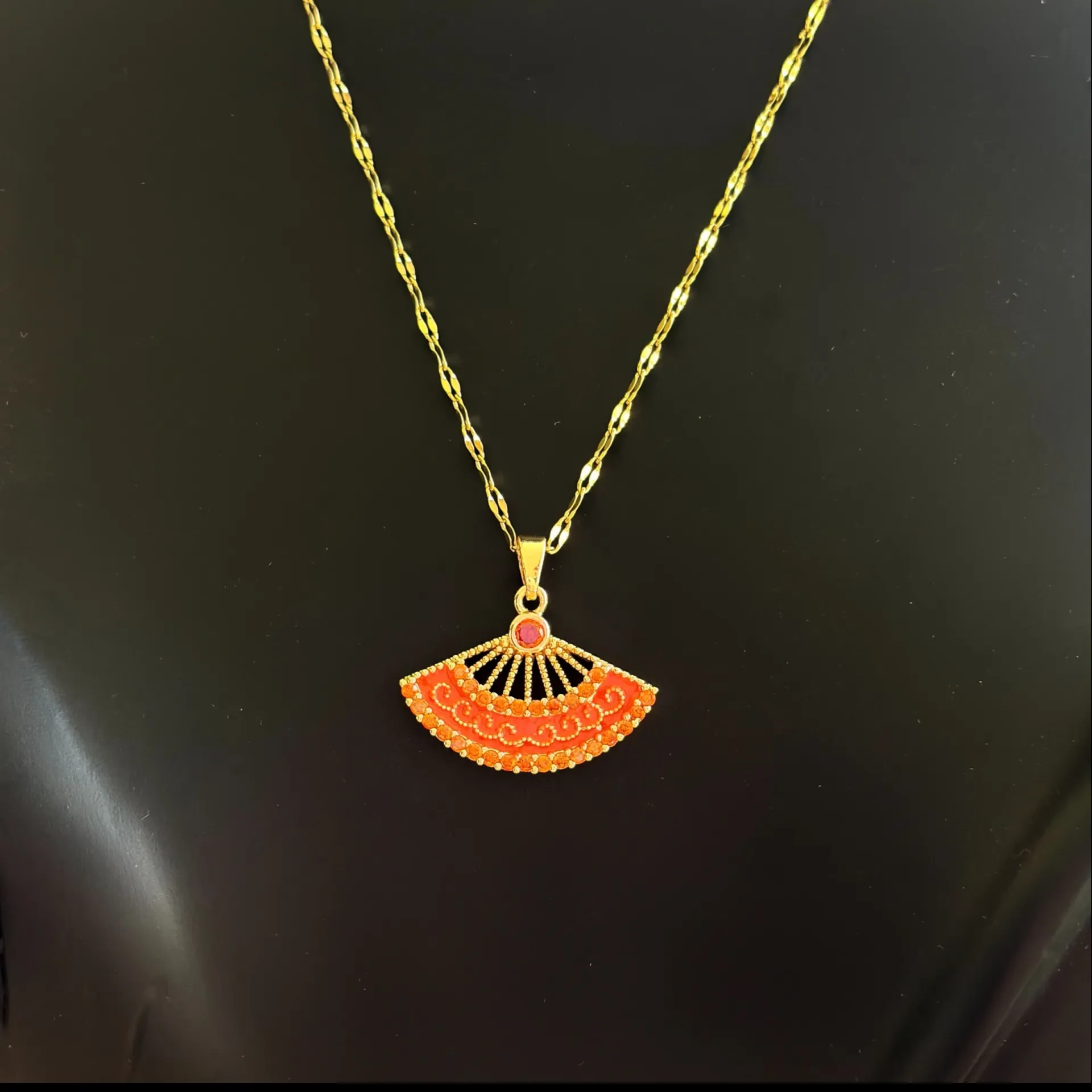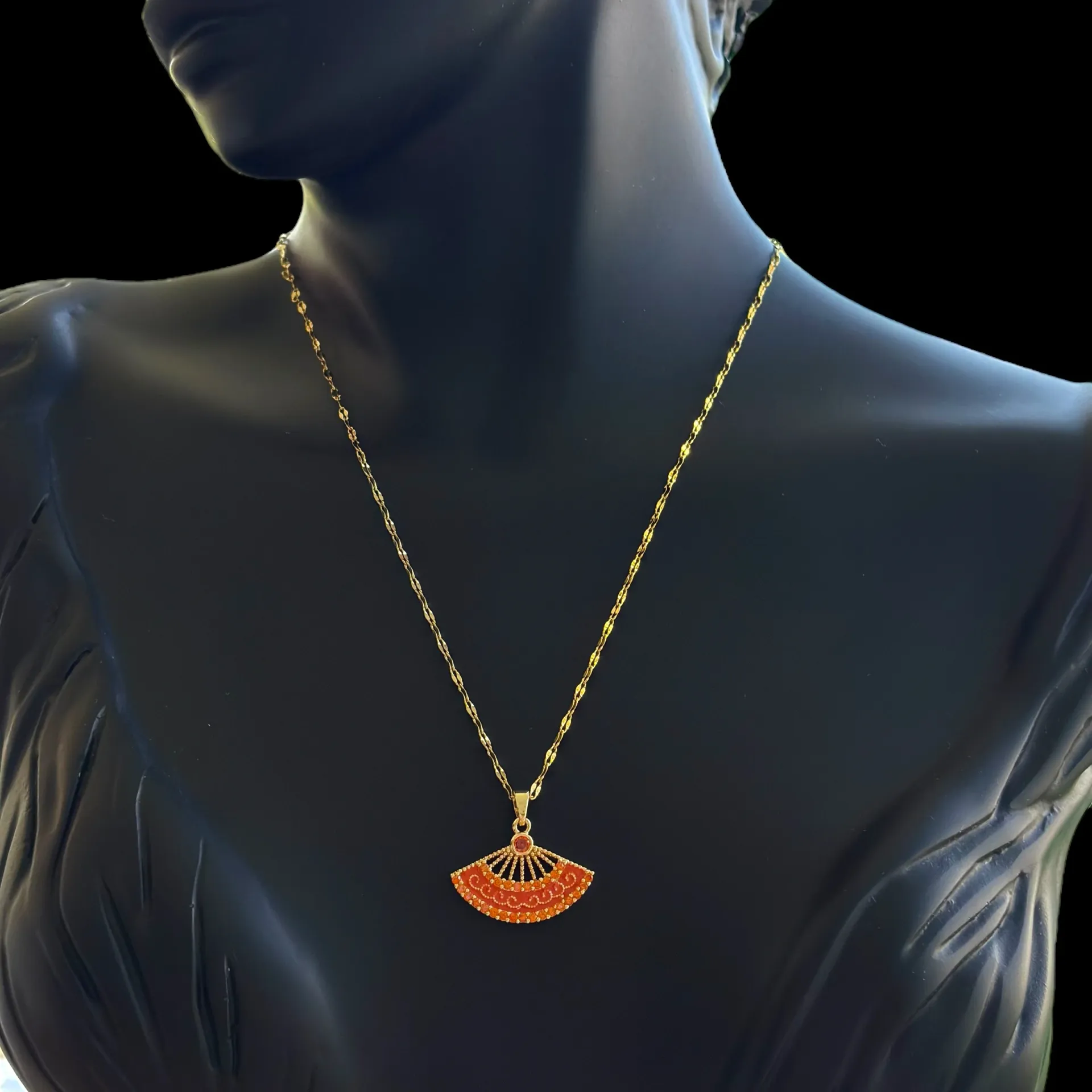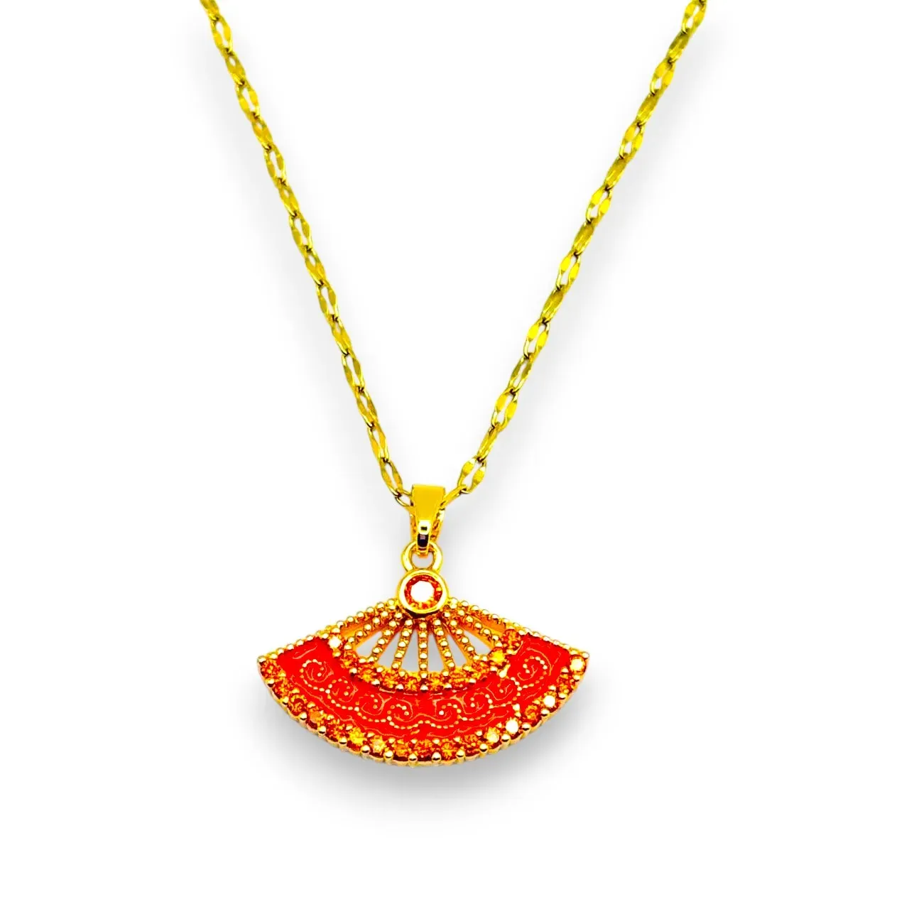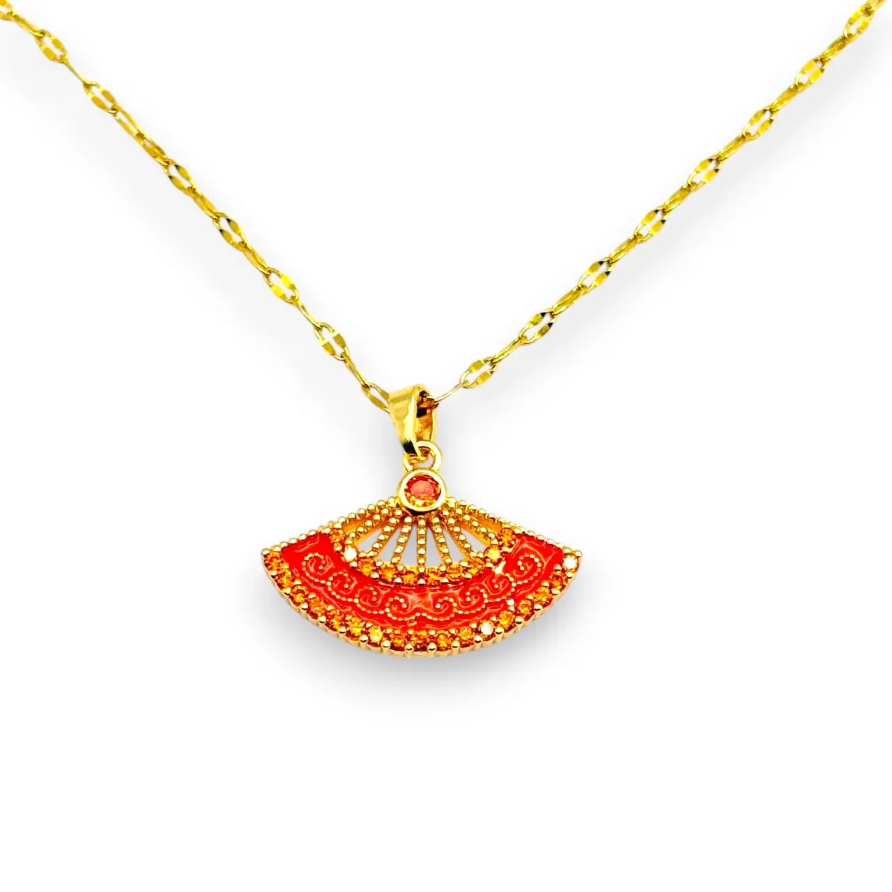 Estetiğin ve Şıklığın Simgesi: Bu özel tasarım kolye, zarif yelpaze figürüyle sadece bir takıdan çok daha fazlasını sunuyor. Canlı turuncu ve kırmızının büyüleyici tonlarıyla renklendirilmiş, ışıltılı taşlarla bezeli yelpaze ucu, klasik şıklığı modern bir dokunuşla birleştiriyor. Detaylı işlemeleri ve parlayan taşlarıyla, her bakışı üzerine çekecek bu kolye, zarafetinizi ve asil duruşunuzu tamamlayacak.