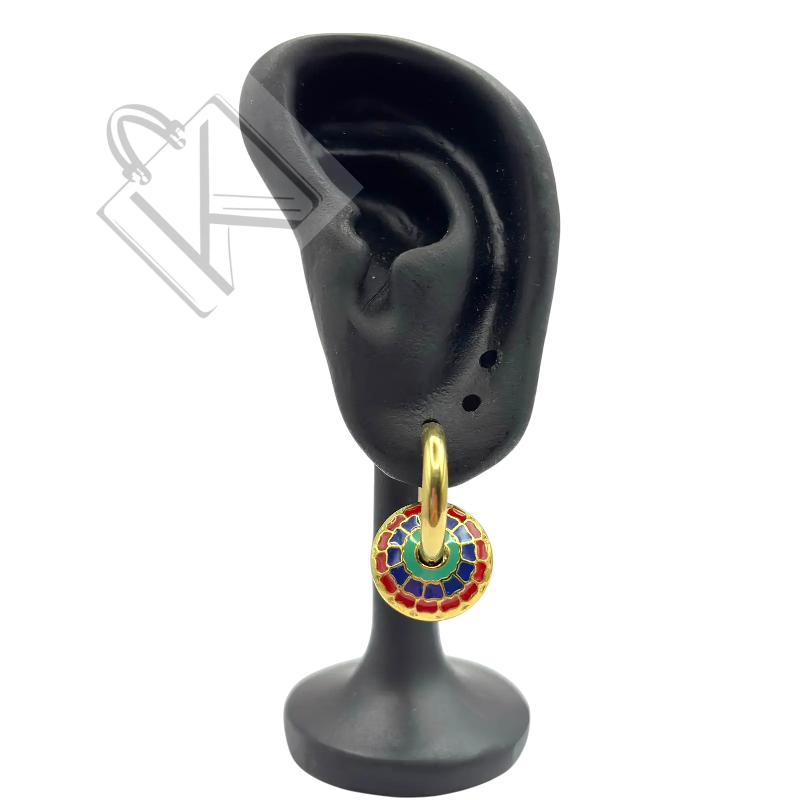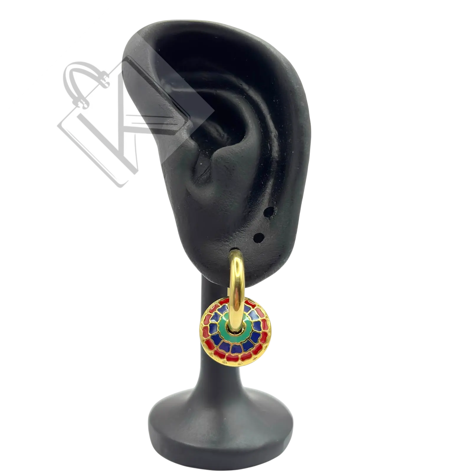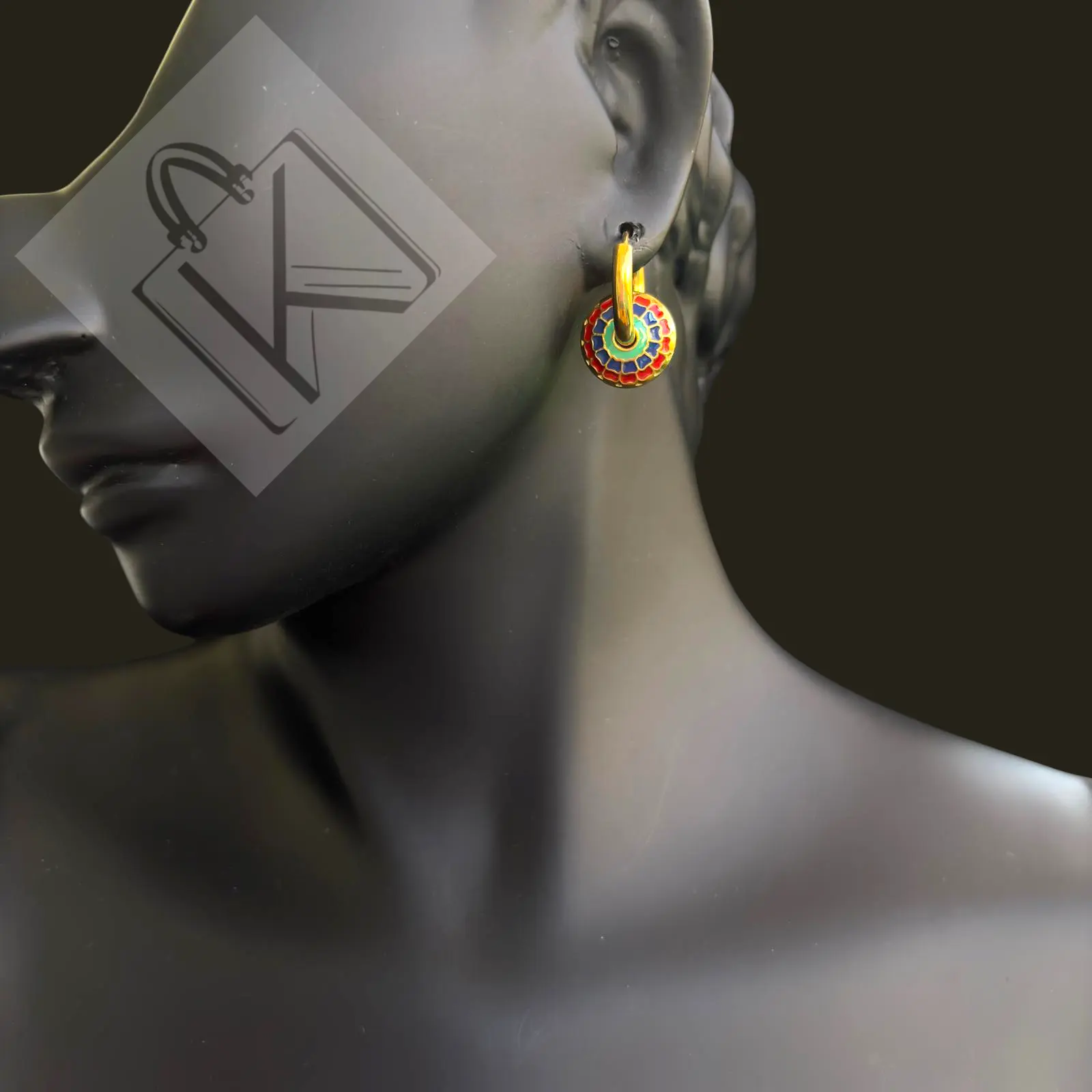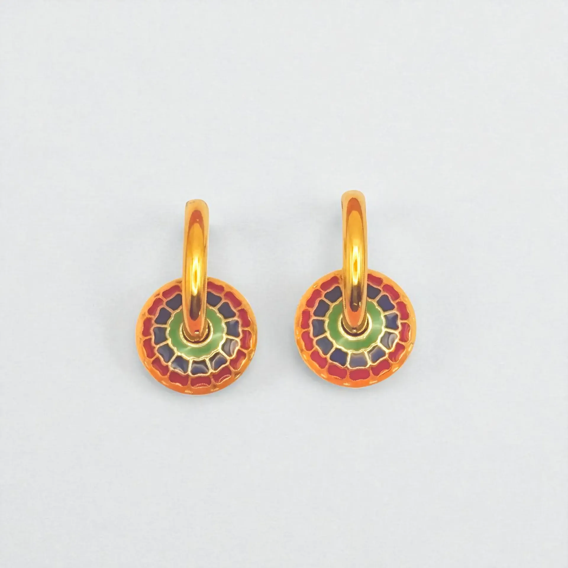 Doğu’nun etnik esintilerini modern şıklıkla buluşturan Altın kaplama emaye küpe, kırmızı, yeşil ve mavi tonlarının simetrik desenlerle birleştiği sanatsal bir tasarımdır. Yuvarlak formu, sofistike ve dikkat çekici bir görünüm kazandırır.