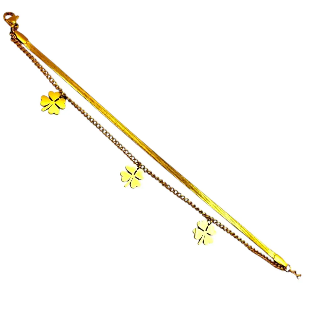 Çift Zincirde Şansın İfadesi: Bu özel tasarım bileklik, iki katmanlı zincir yapısıyla sadece bir takıdan çok daha fazlasını sunuyor. Birinci katmanda yer alan modern ve pürüzsüz "yılan derisi" zincir, bileğinize sofistike bir dokunuş katarken, ikinci katmandaki narin ince zincir üzerinde sallanan zarif yonca figürleri, şansı, umudu, aşkı ve inancı simgeliyor. Bu bileklik, minimalist ancak dikkat çekici duruşuyla her kombininize zarafet ve pozitif bir hava katacak.